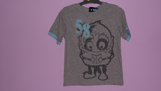 Boys size 4 shirt it's gray with light blue around the sleeve edges, It has a picture & number 58 on the front.